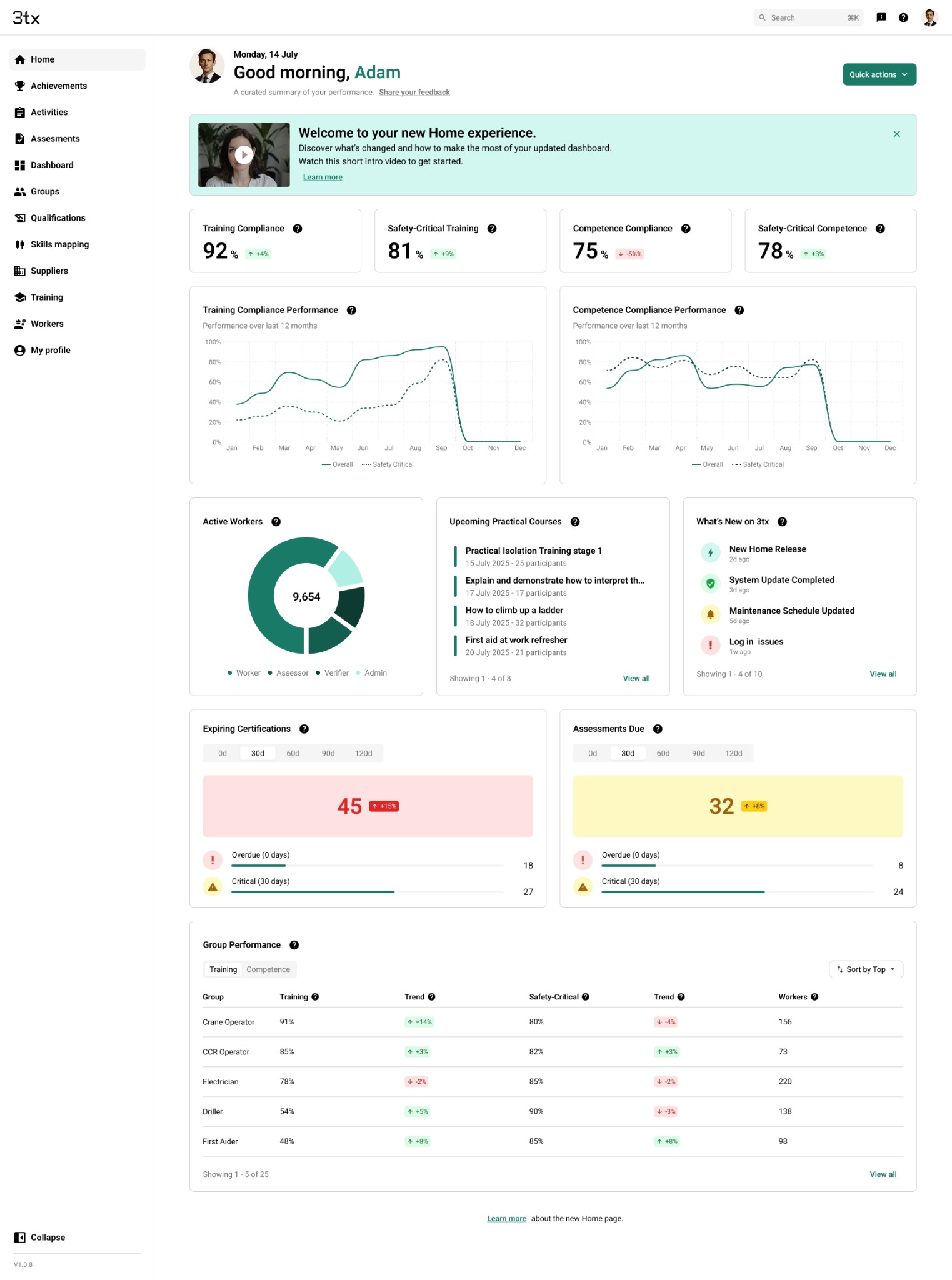 As Lead Designer (contract) at 3t Global, I redesigned the 3TX Home experience to help safety-critical organisations manage training, competence and learning delivery in one unified platform—reducing admin load while improving real-time visibility for compliance and workforce readiness.